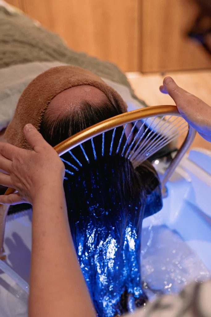 Gommage du cuir chevelu au sel marin, suivi d’un rinçage sous arche d’eau.