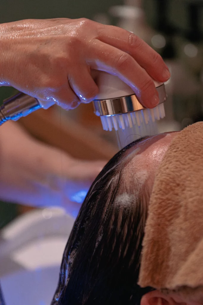Premier shampoing 100 % naturel avec outils de massage, puis second shampoing et rinçage sous arche d’eau.